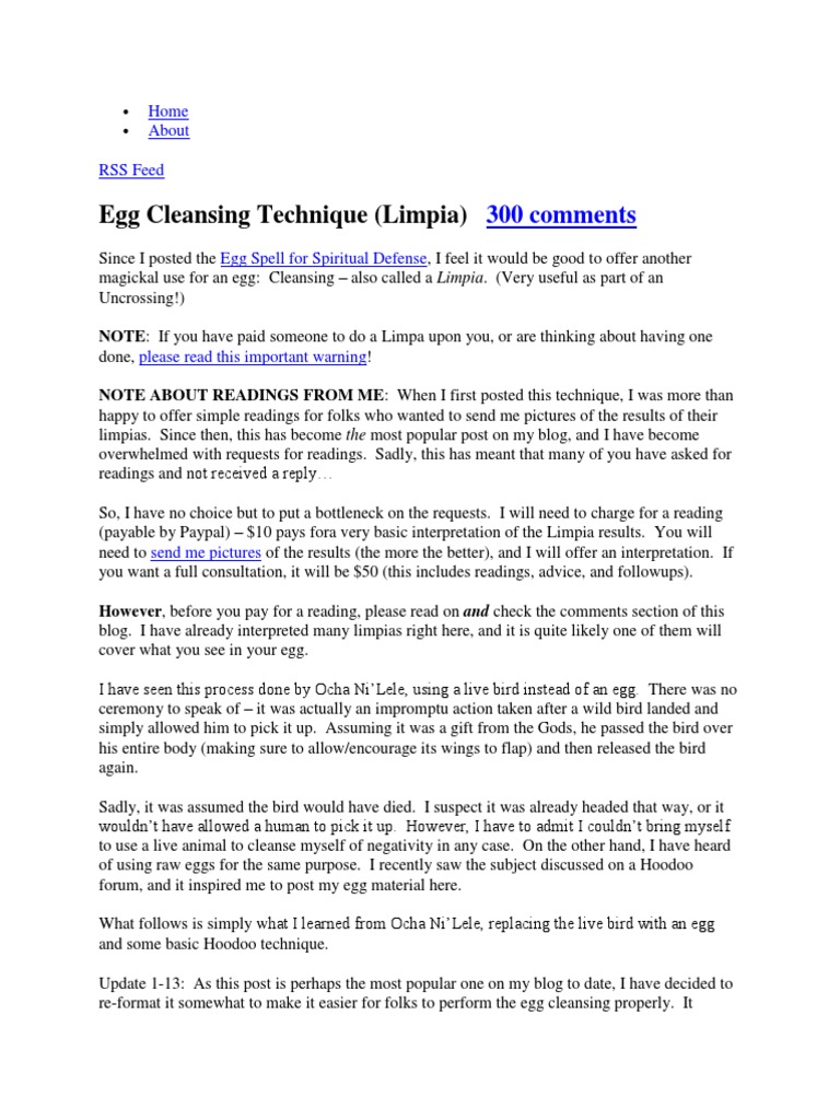 A few extra tips for egg cleansing hold the egg at the base of the head, where the skull and the spine meet. Let it sit there for about thirty minutes, then take it out side and dump it at the roots of a tree or you can flush it down the toilet. Once you are done, break the egg into the glass of water. Calmly rub the egg all over your body from head to toe. Be calm and rub the egg all over your body from head to toe as you say out this;
